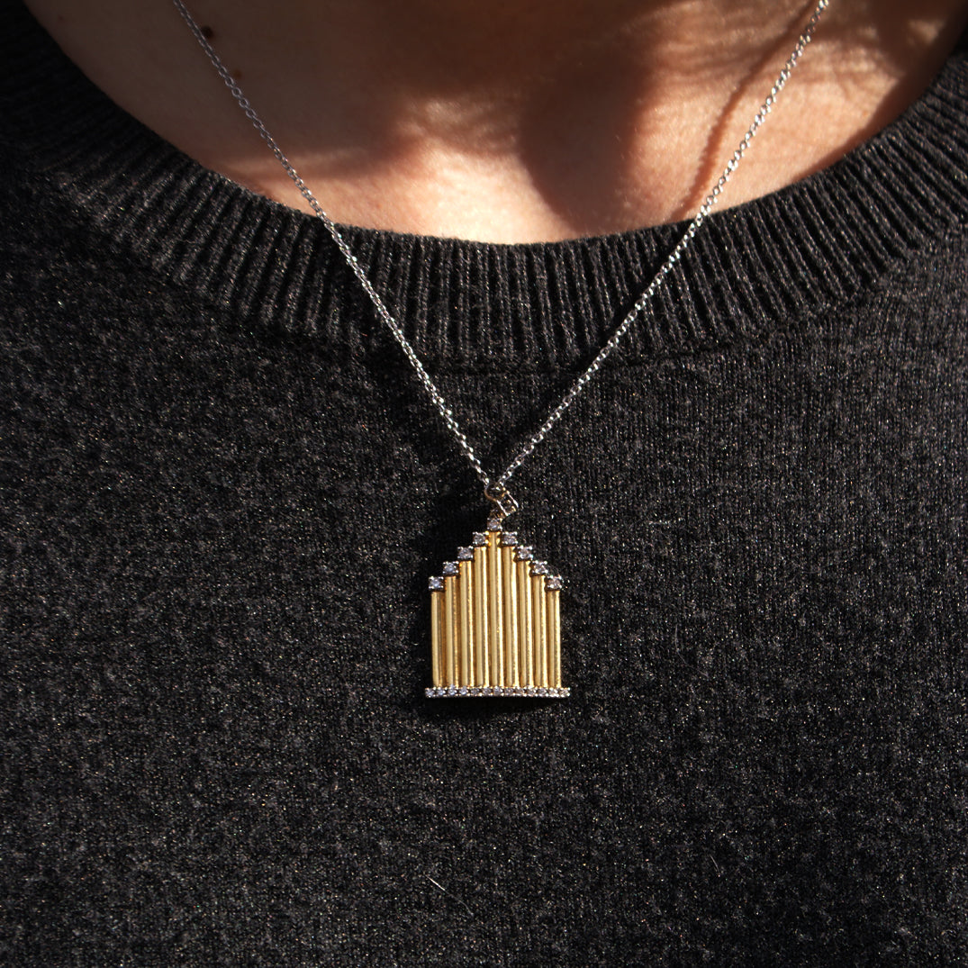 Il Girocollo Duomo Adamas reinterpreta le celebri guglie della cattedrale con una linea elegante e minimale, realizzata in oro 18 carati e impreziosita da diamanti naturali accuratamente selezionati.